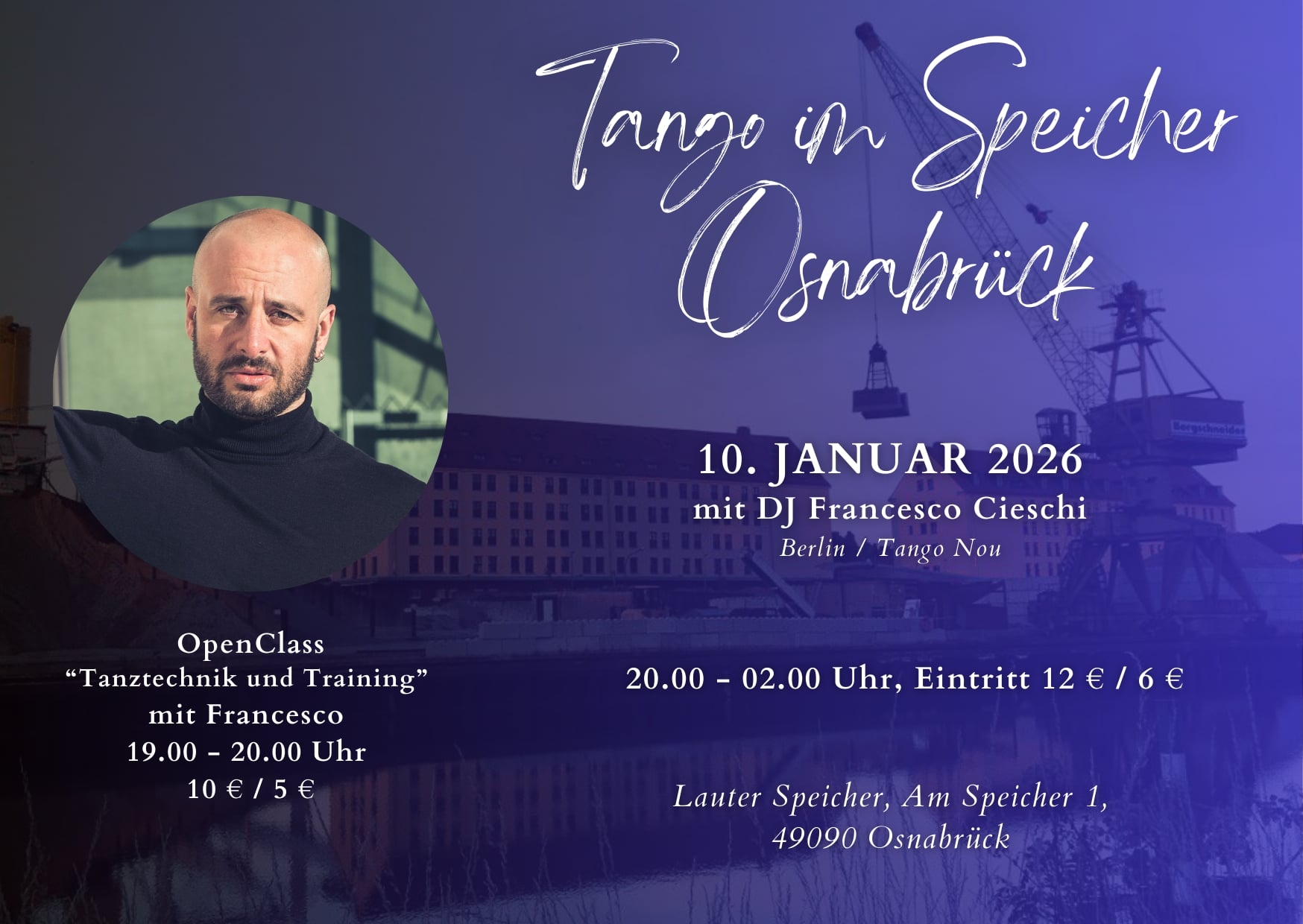 | 10.01.2026 (Samstag) | Tango im Speicher (LAUTER Speicher Am Speicher 1 49090 Osnabrück) |